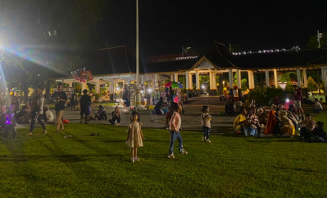 Meski hujan mengguyur beberapa hari lalu, tekstur tanah dan rerumputan alun-alun tidak becek. Tribun alun-alun juga ramai, warga bersantai. Menikmati malam, tahu petis, dan gorengan.