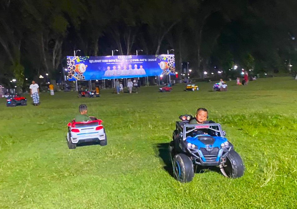 Pantauan lokasi, anak-anak bermain baling-baling lampu hias. Warna-warni. Melepas baling-baling seperti ketapel. Tampak asyik sekali. Ada juga mengendarai mobil mainan dengan remote.