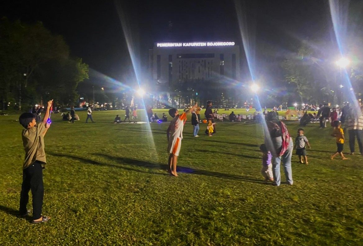Anak-anak berlarian di rerumputan. Riang. Gelak tawa anak-anak berderak di atas rerumputan Alun-Alun Bojonegoro Sabtu (18/4) malam. Keceriaan dan kehangatan keluarga mengisi sudut-sudut wahana permainan.