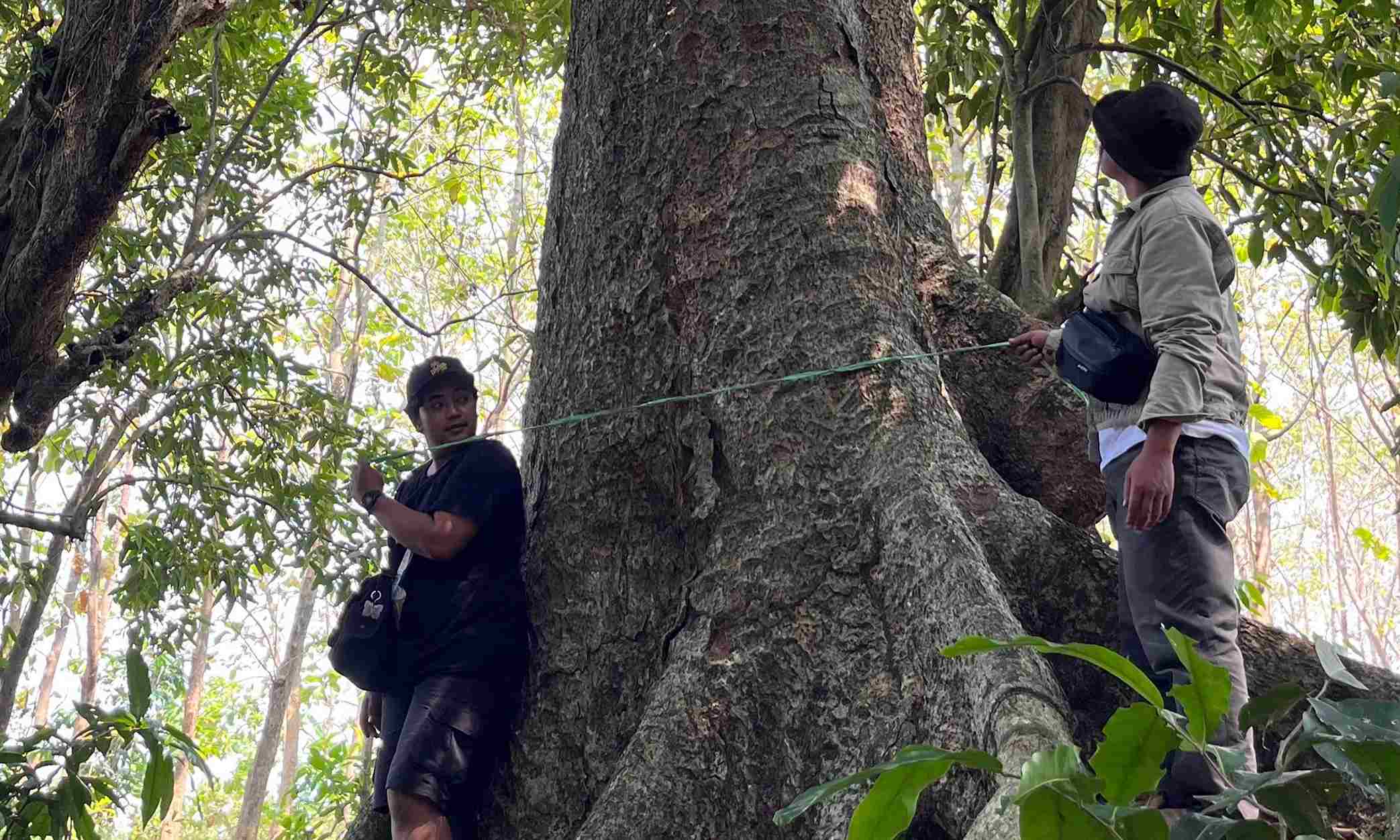 RISET: Dua etnograf menginvetarisir pohon-pohon raksasa di Bojonegoro, beberapa waktu lalu. Risetnya bisa diakomodir BRIDA. (Foto: Yusab Alfa/Bojonegoro Raya)