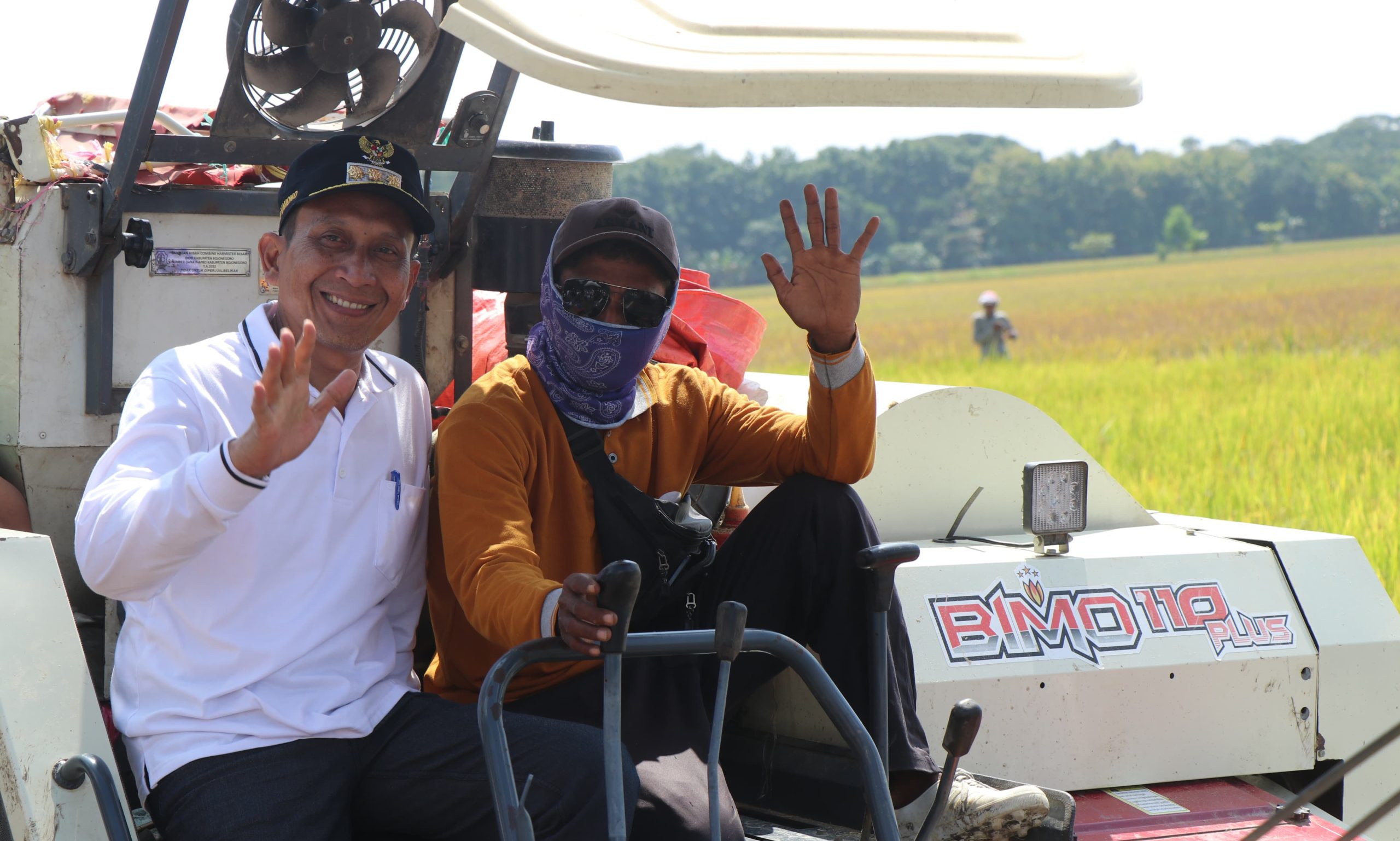 Petani tersenyum atas panen raya di persawahan turut Desa Sukorejo tersebut. Setyo Wahono dan Nurul Azizah turut naik harvester bersama petani dalam panen raya padi dimaksud. Adem.