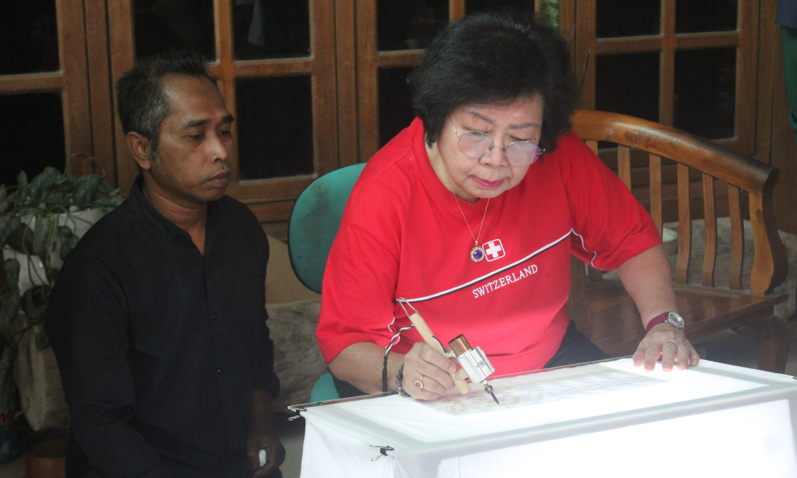 Mirawati Sudjono dan Meliawati Ang juga diberi kesempatan menyanting–membuat Batik Obor Sewu. Keduanya tampak sedikit tegang. Belum biasa.