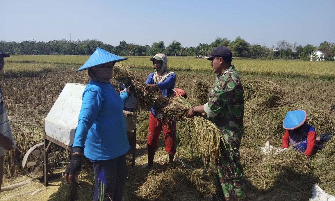 MANUAL: Petani dan tentara di Bojonegoro saat menggiling padi hasil panen, beberapa waktu lalu. (Foto: Istimewa)
