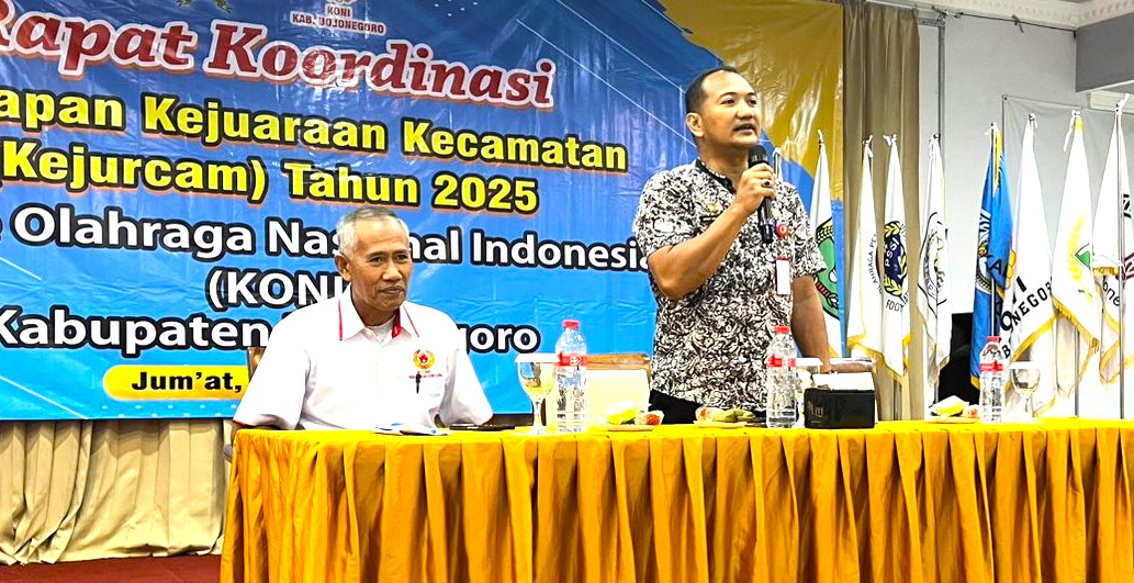Komite Olahraga Nasional Indonesia (KONI) Bojonegoro mengumpulkan koordinator olahraga kecamatan (KOK). Persiapan dan dialog kejurcam sebagai embrio pelaksanaan pekan olahraga kecamatan (porcam), Jumat (20/6/25).