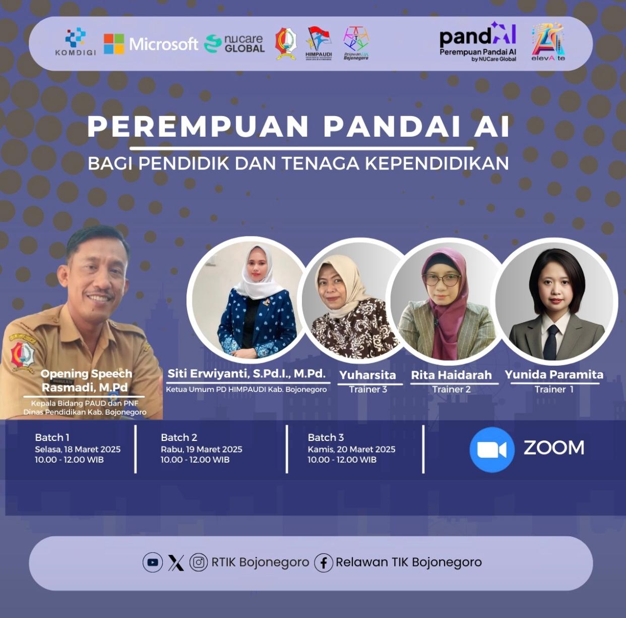 Pelaksanaan batch 1 program Perempuan PandAI 2025 ini digelar Himpaudi Bojonegoro dan RTIK Bojonegoro, Selasa (18/3/2025) pagi, via Zoom. Dibuka oleh Kepala Bidang PAUD dan PNF Dinas Pendidikan (Disdik) Bojonegoro Rasmadi, juga Ketua Himpaudi Bojonegoro Siti Erwiyanti.