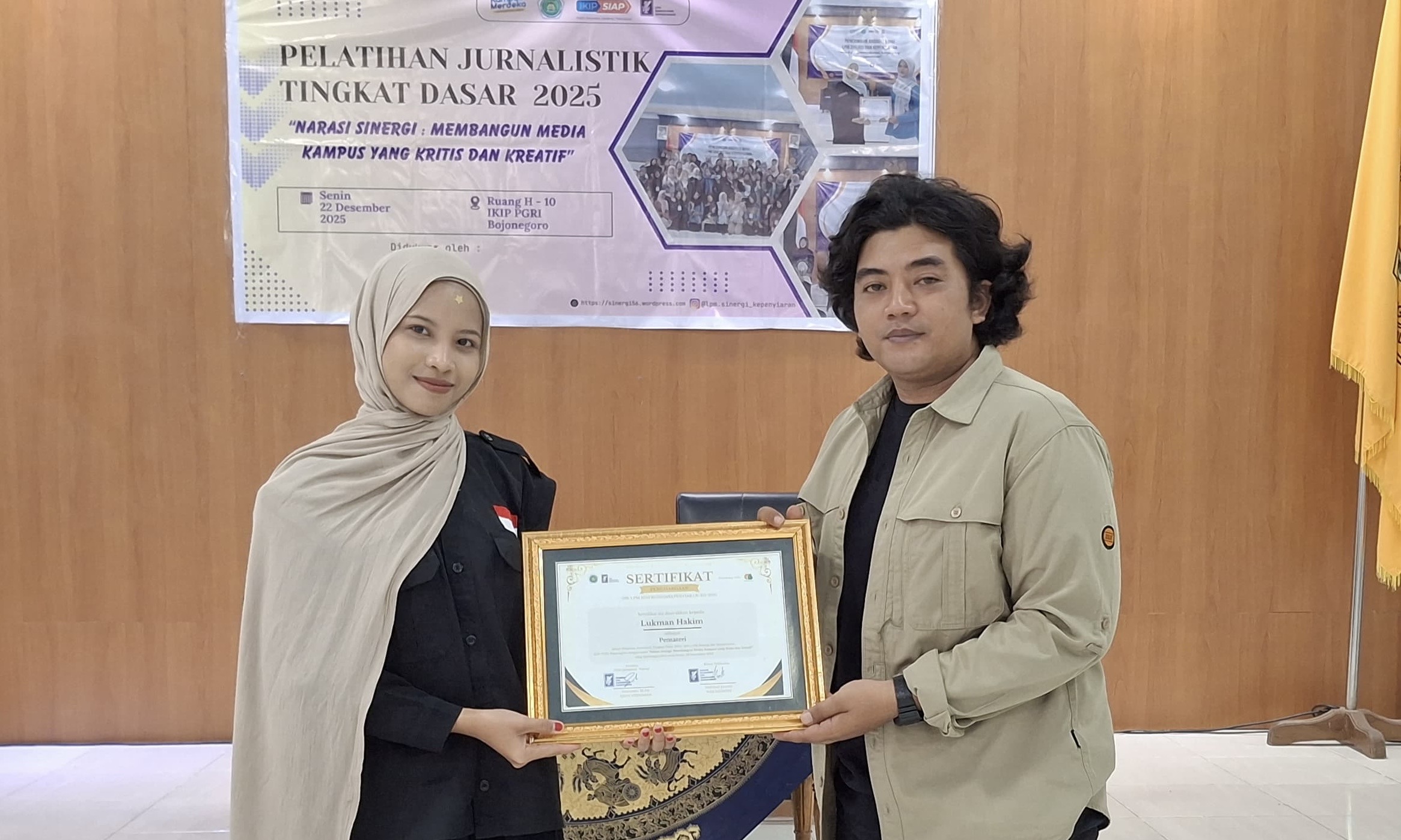 Sekitar 20 mahasiswa mengikuti pelatihan di Audiotorium IKIP PGRI Bojonegoro, Senin (22/12/2025) pagi itu. Mereka calon anggota persma Sinergi IKIP PGRI Bojonegoro.