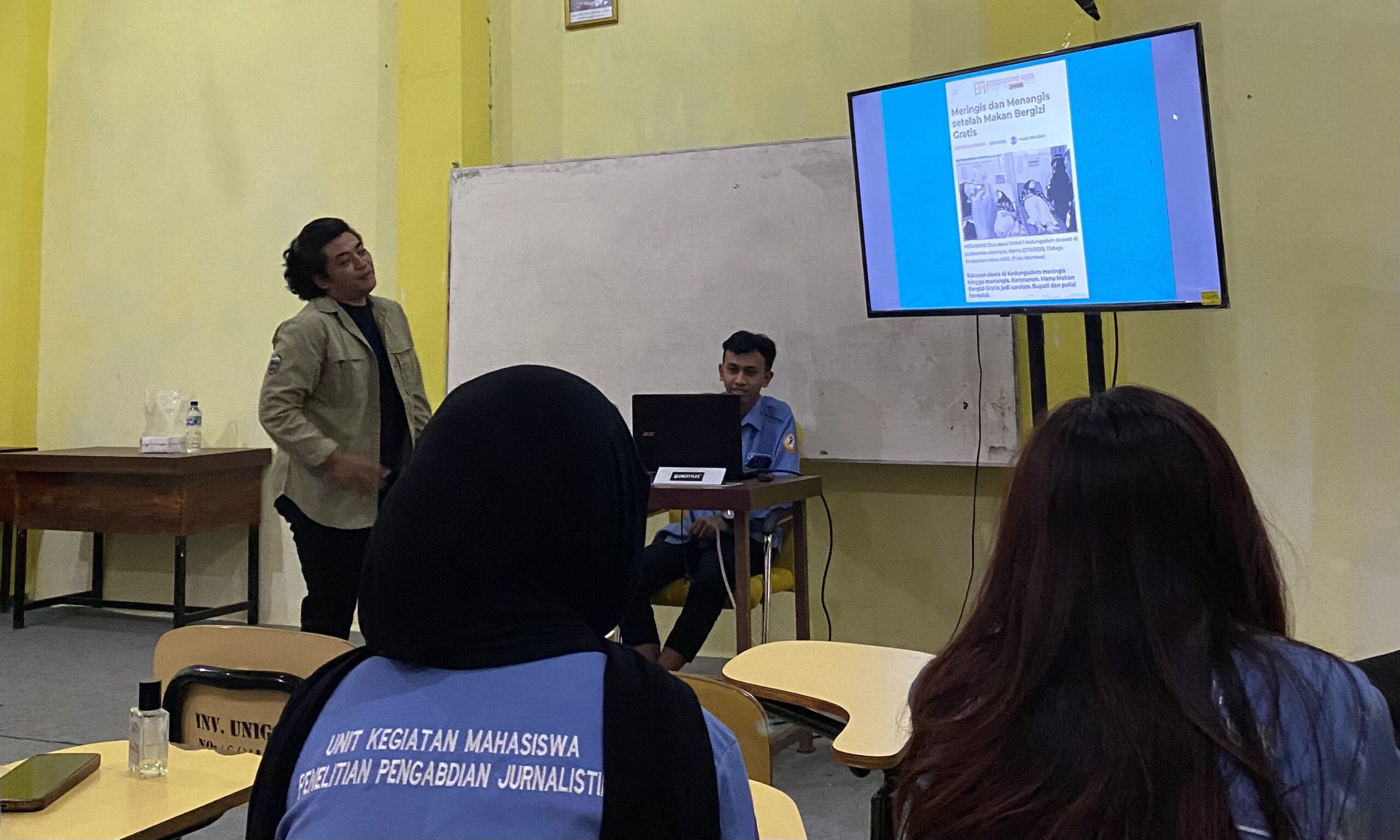 Di Unigoro, Yusab memaparkan materi tentang feature. Anggota Aliansi Jurnalis Independen (AJI) tersebut membedah feature sebagai berita yang bercerita.