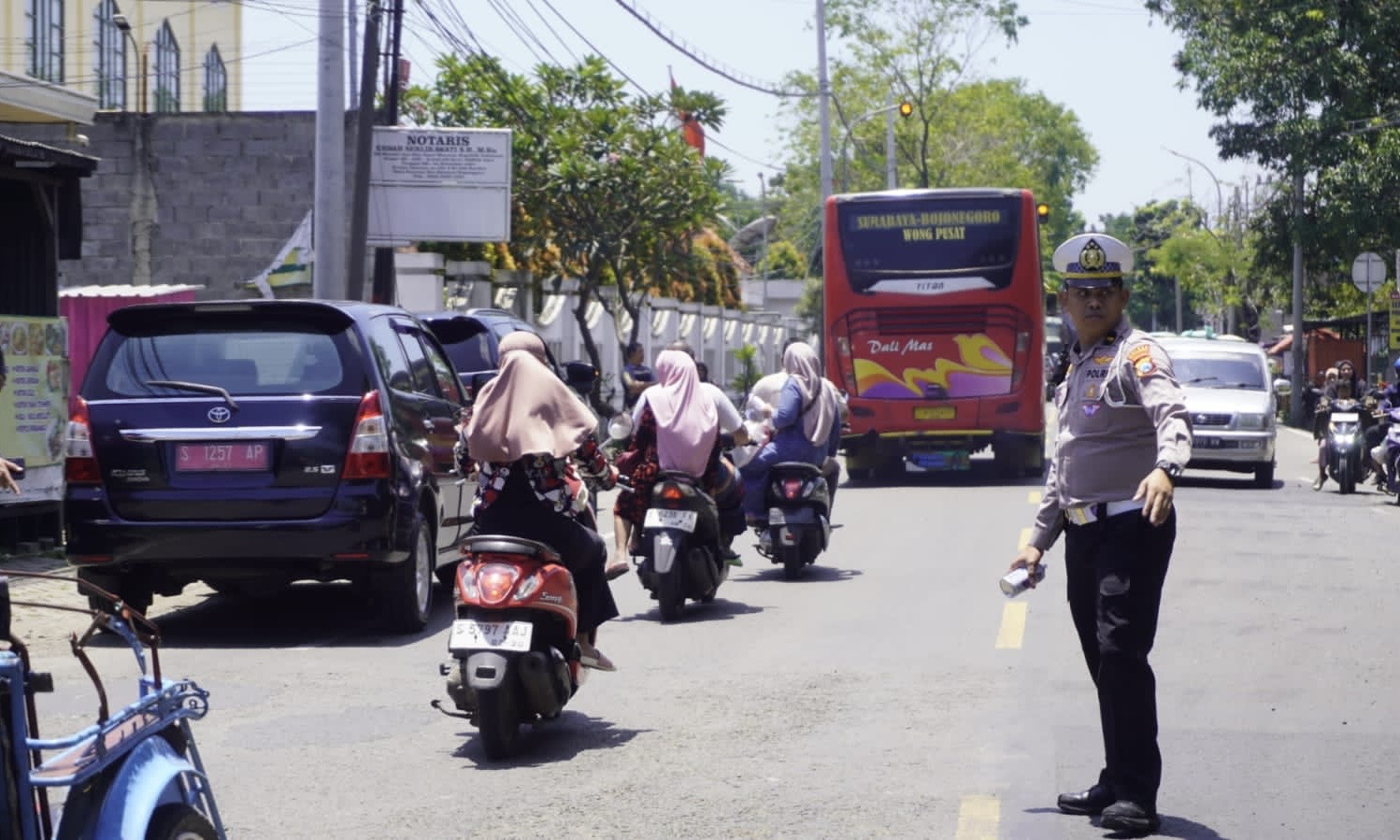 SIAGA: Salah satu personel Satlantas Polres Bojonegoro saat mengatur lalu lintas di Jalan Raya Bojonegoro–Babat turut Kecamatan Baureno. (Foto: Istimewa)