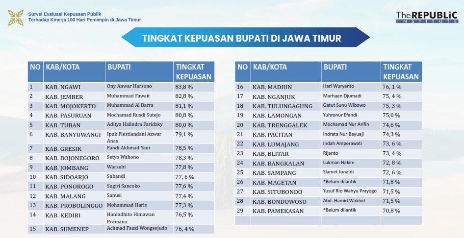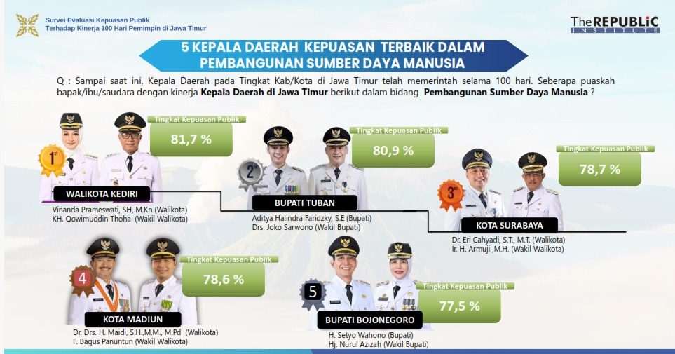 Posisi kedua Bupati–Wabup Tuban, 80,9 persen. Posisi ketiga Wali Kota–Wawali Kota Surabaya, 78,7 persen. Posisi keempat Wali Kota–Wawali Kota Madiun, 78,6 persen.
