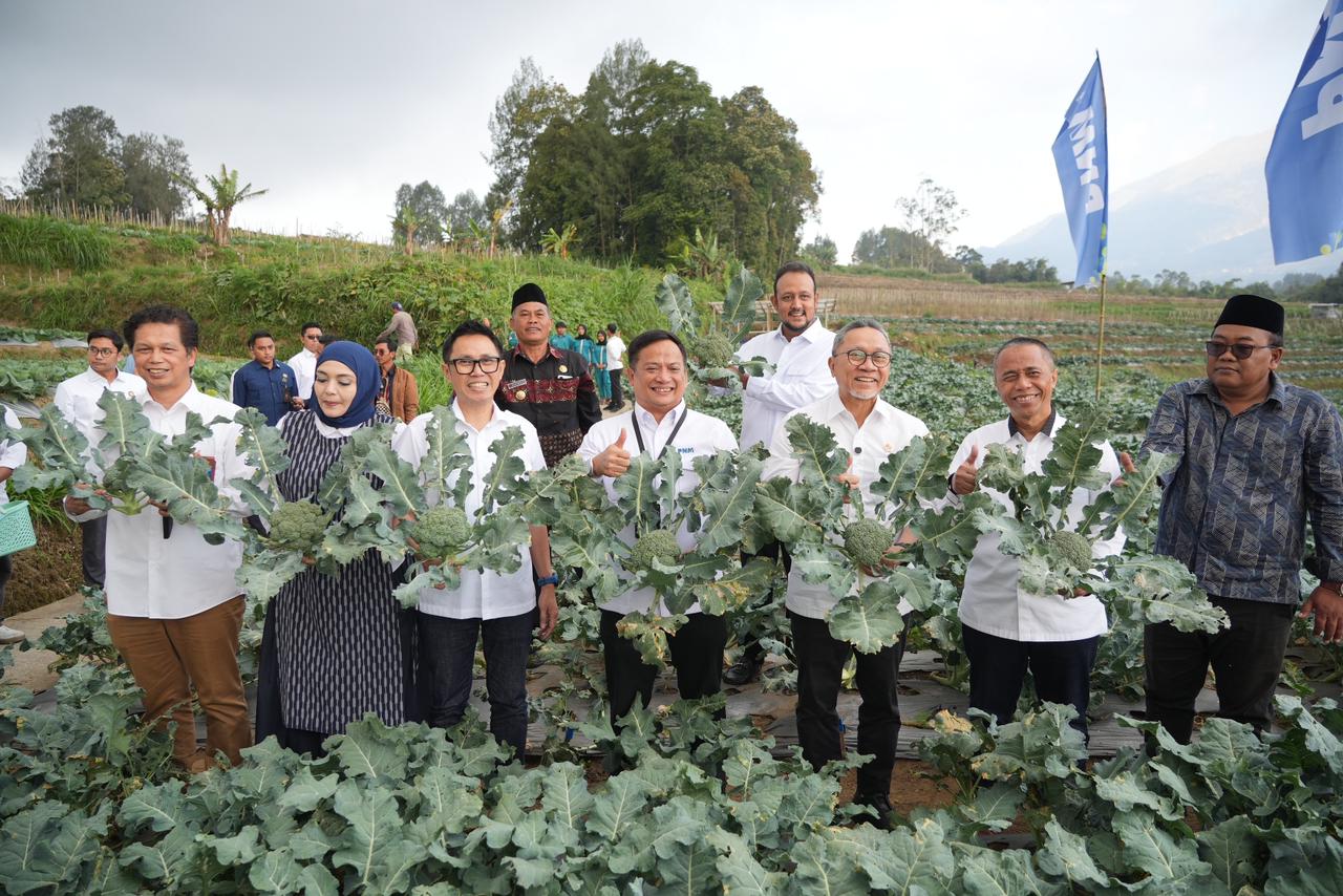 BERMANFAAT: Menko Pangan Zulkifli Hasan tampak ceria mengikuti panen brokoli oleh nasabah PNM. Permodalan hingga pendampingan berusaha. Foto PNM.