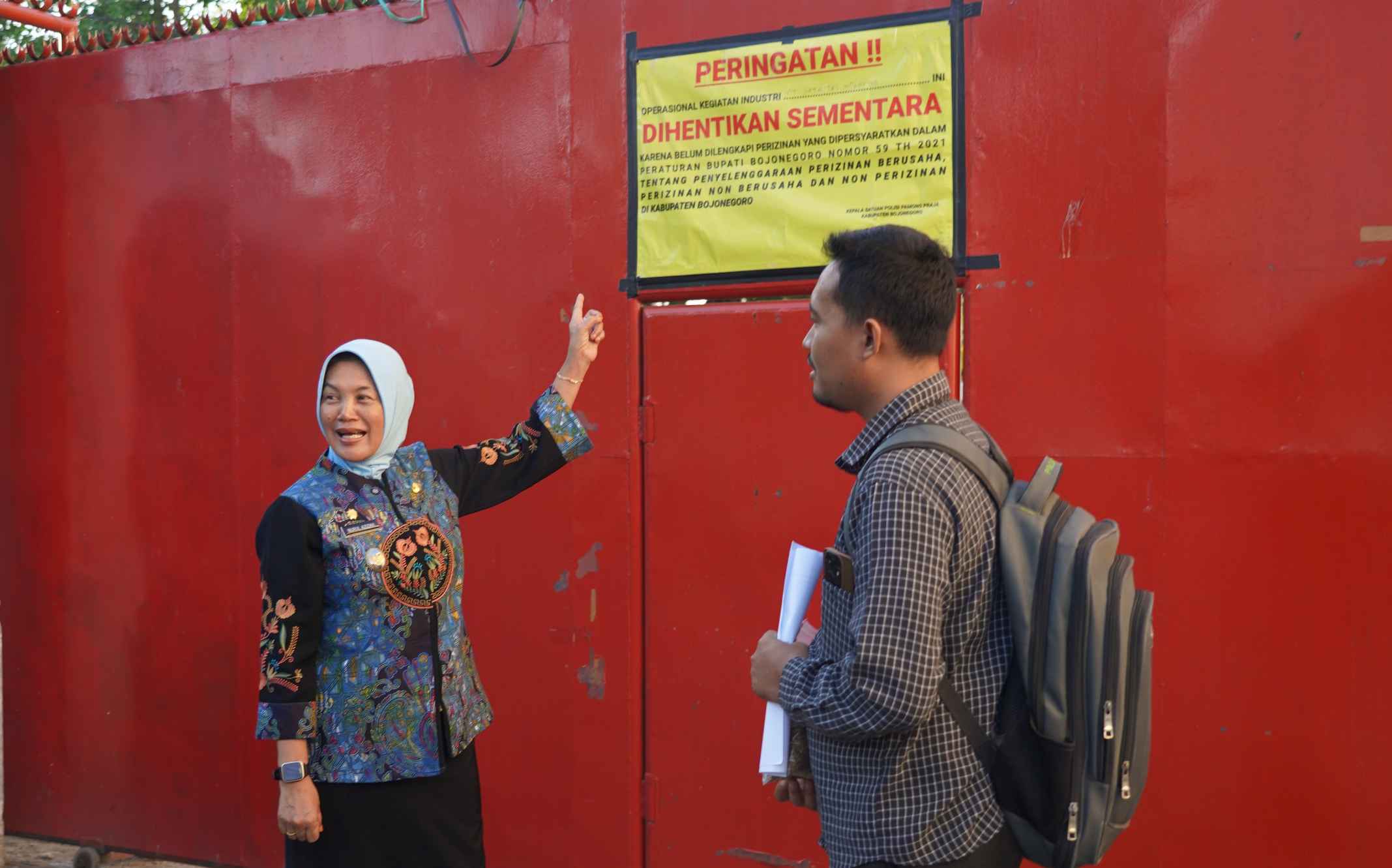 PABRIK TEMBAKAU: Wabup Nurul Azizah sidak dan menunjukkan banner yang dipasang di pagar PT Sata Tec. Banner bertuliskan penghentian sementara operasional. Foto Prokopim untuk Bojonegoro Raya.