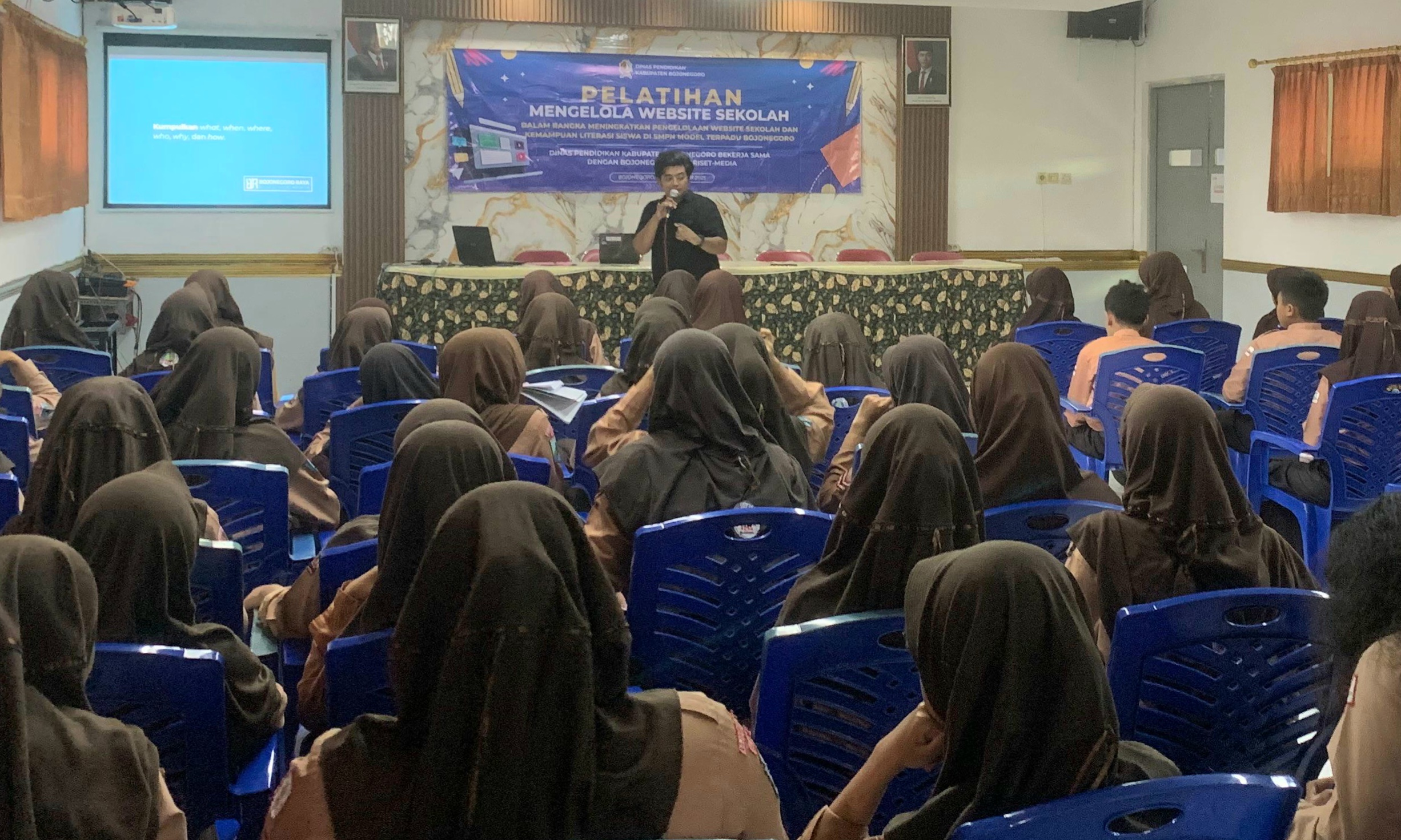 Para pelajar SMPN MT Bojonegoro kelas 7, 8, 9 itu mengikuti pelatihan jurnalistik dan pengelolaan website yang digelar Dinas Pendidikan (Disdik) Bojonegoro.