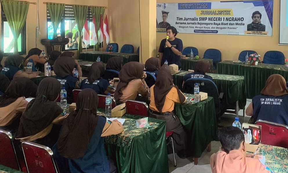 Adapun, pelatihan jurnalistik tersebut diselenggarakan SMPN 1 Ngraho pada Sabtu (27/9/2025) pagi—sore. Bertempat di aula sekolah setempat.
