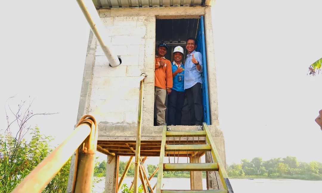 HASIL KOLABORASI: Setyo Wahono, Yusuf Hadiyanto, dan petani berada dalam ruang pompa air yang sudah bertenaga listrik, Rabu (23/4/2025). (Foto: Pemkab Bojonegoro)