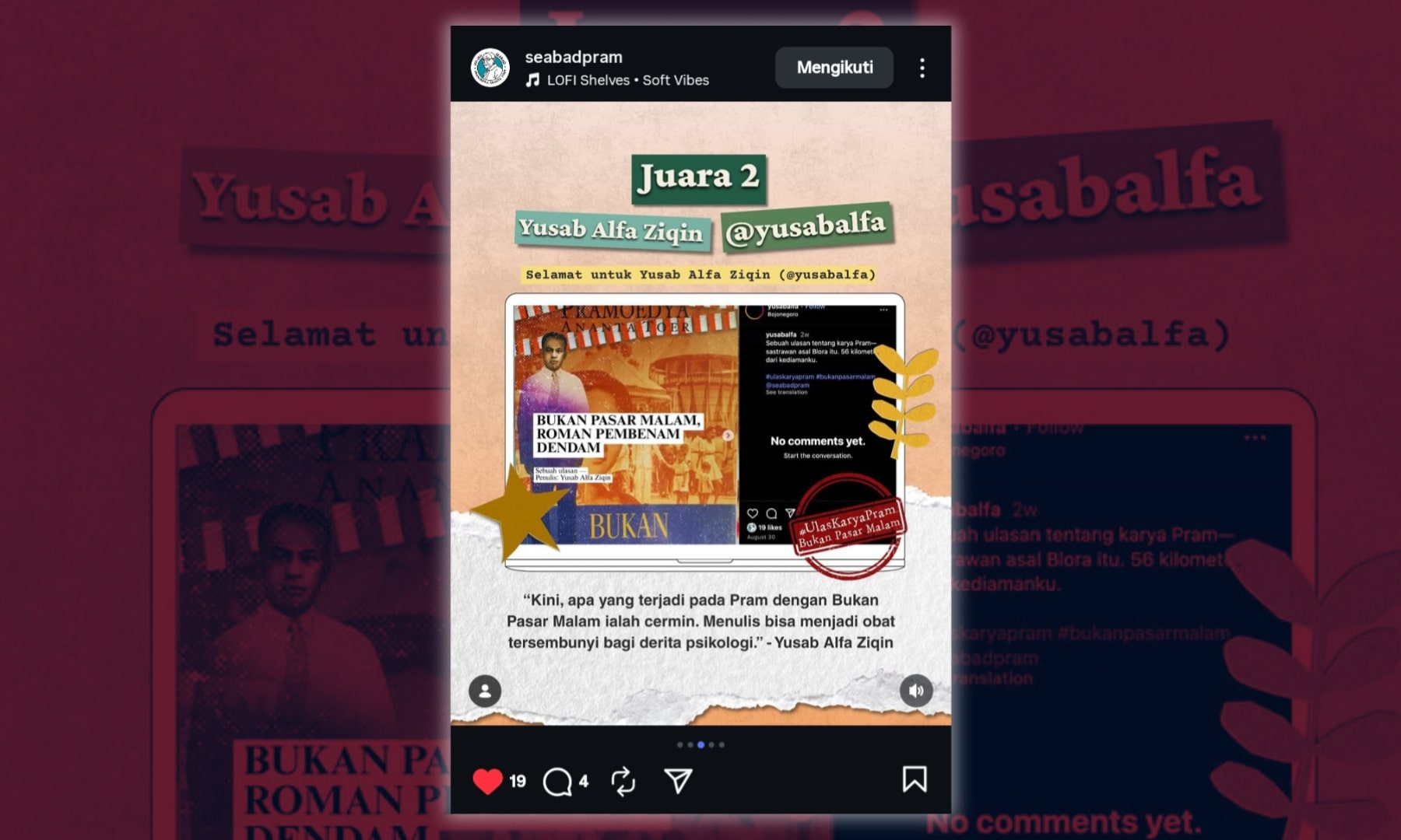 Dalam ajang yang dihelat di belantara Instagram itu, Yusab Alfa Ziqin mengulas Bukan Pasar Malam sebagai roman pembenam dendam.